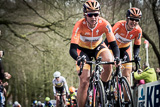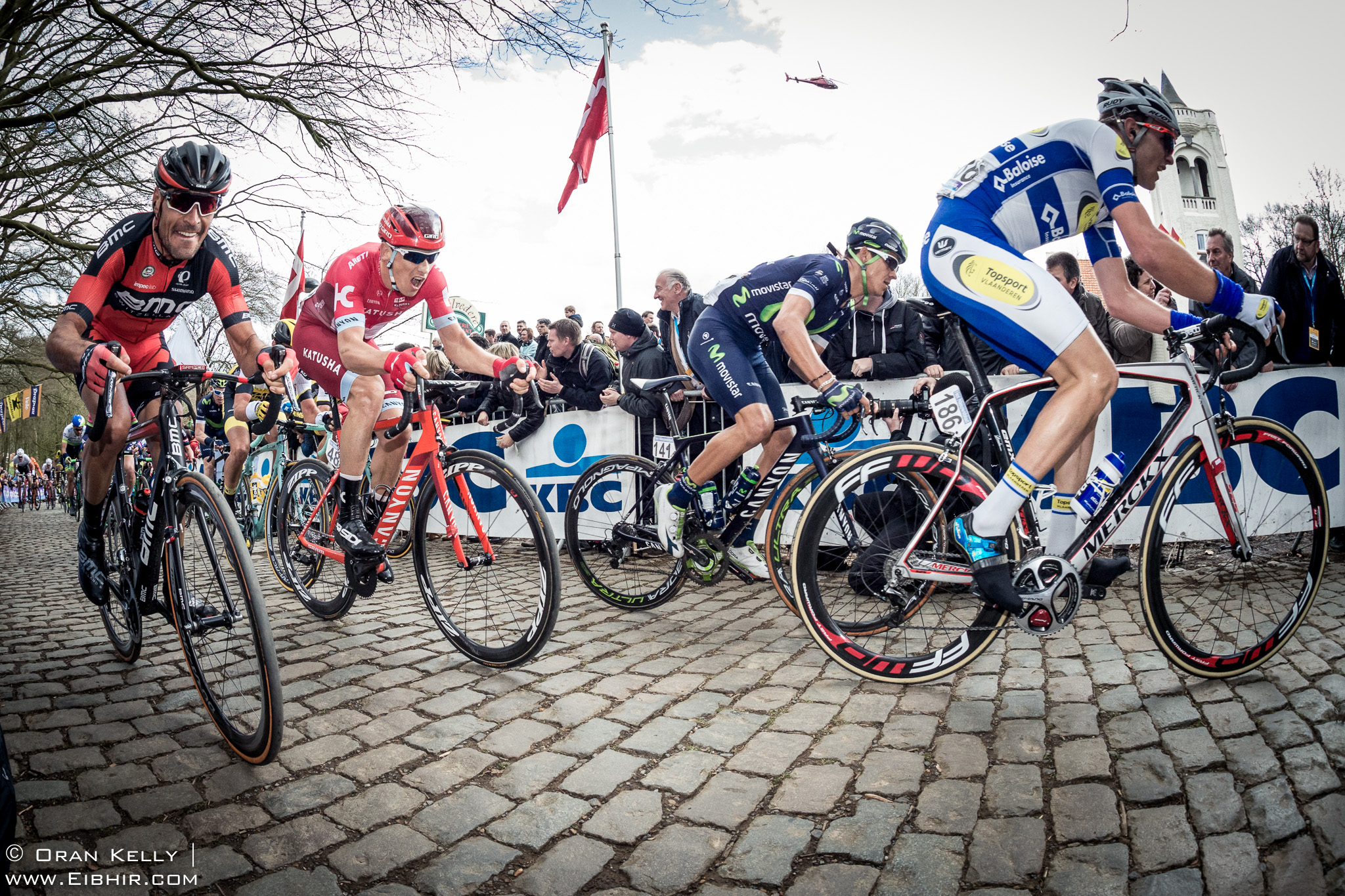 2016_GentWevelgem_Peloton_Kemmelberg 2016 GentWevelgem, Peloton on the Kemmelberg. L-R ManuelQUINZIATO(ITL-BMC), AlexanderPORSEV(RUS-KAT), AndreyAMADOR(CRC-MOV), Bert VANLERBERGHE(BEL-TSV)