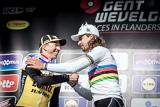 2016_GentWevelgem_Podium_1stPeterSAGAN(SVK-TNK)_2ndSepVANMARCKE(BEL-TLJ) 2016 GentWevelgem, Podium, 1st PeterSAGAN(SVK-TNK) congratulates 2ndSepVANMARCKE(BEL-TLJ)